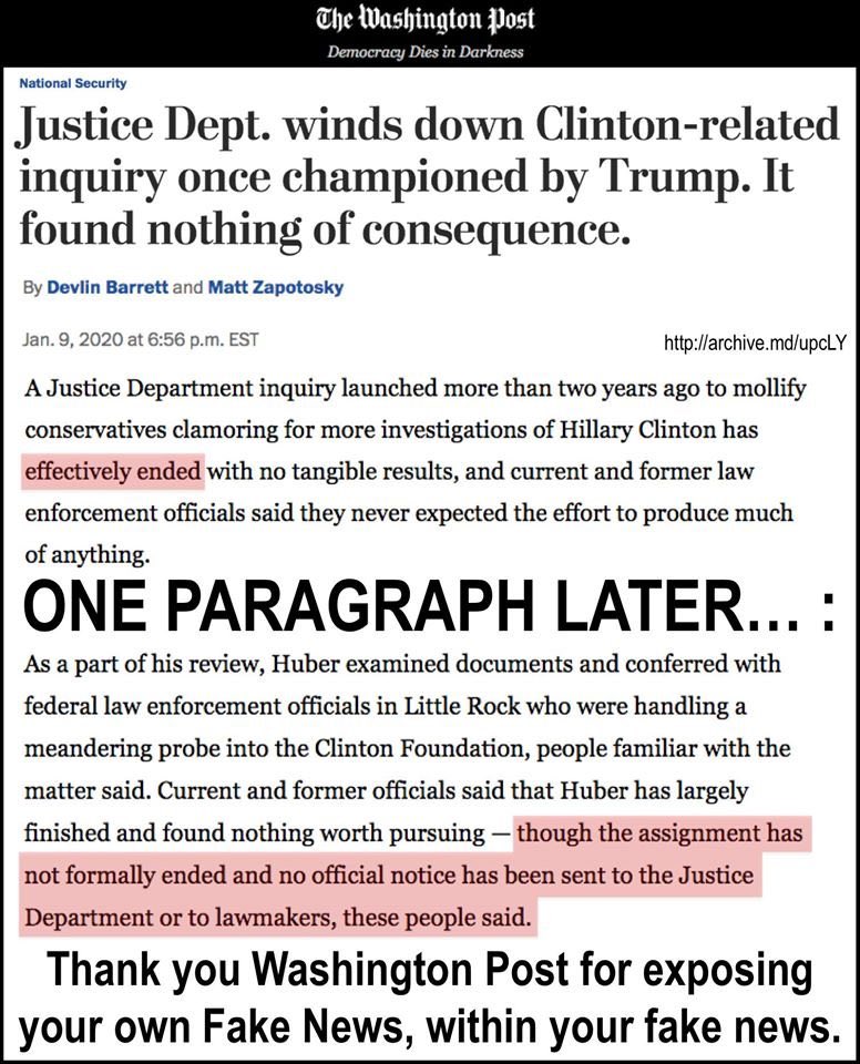 So the WaPo is saying that it has ended but it hasn’t ended, and this is coming from people, who, who are these people, if you notice they cannot back any of this up, Barr has even received anything as of yet, did you notice what they do not have, leaks from the investigation, they are in the dark, just like IG FISA report, they are in the dark with Huber and Durham, the MSM [DS] have no idea what was found. We also need to remember that alot of Huber found was turned over to Durham,