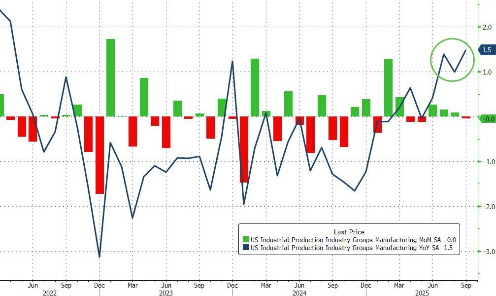 US Manufacturing output was unchanged in September (slowing from the 0.1% MoM rise in August), but, like IP, that supported a 1.5% YoY rise in output, its highest level since April 2022…