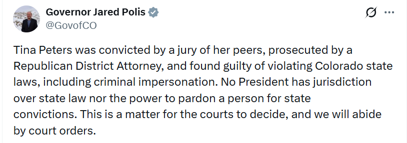 A core (and controversial) element of Ticktin’s legal theory is the untested claim that the U.S. Constitution allows presidents to pardon state-level convictions—a position not supported by precedent, as presidential pardons are explicitly limited to federal offenses under Article II, Section 2. This strategy aims to challenge the boundaries of executive power, potentially setting up a court battle if pursued further, while amplifying the narrative through media and conservative outlets to build public pressure. , this pardon is largely symbolic and legally ineffective because Peters was convicted and sentenced in Colorado state court on charges like attempting to influence a public servant, conspiracy, and official misconduct—not federal crimes.