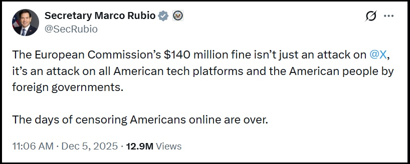 The response to this by President Trump must be merciless, punishing and unrelenting. A standard must be set that the US doesn’t allow foreign tyrants or weasels to bully US companies into wokeness. Period. Bring the pain to EU tyrants @realDonaldTrump — it’s the only way now. https://t.co/Ygs8PyPN9H