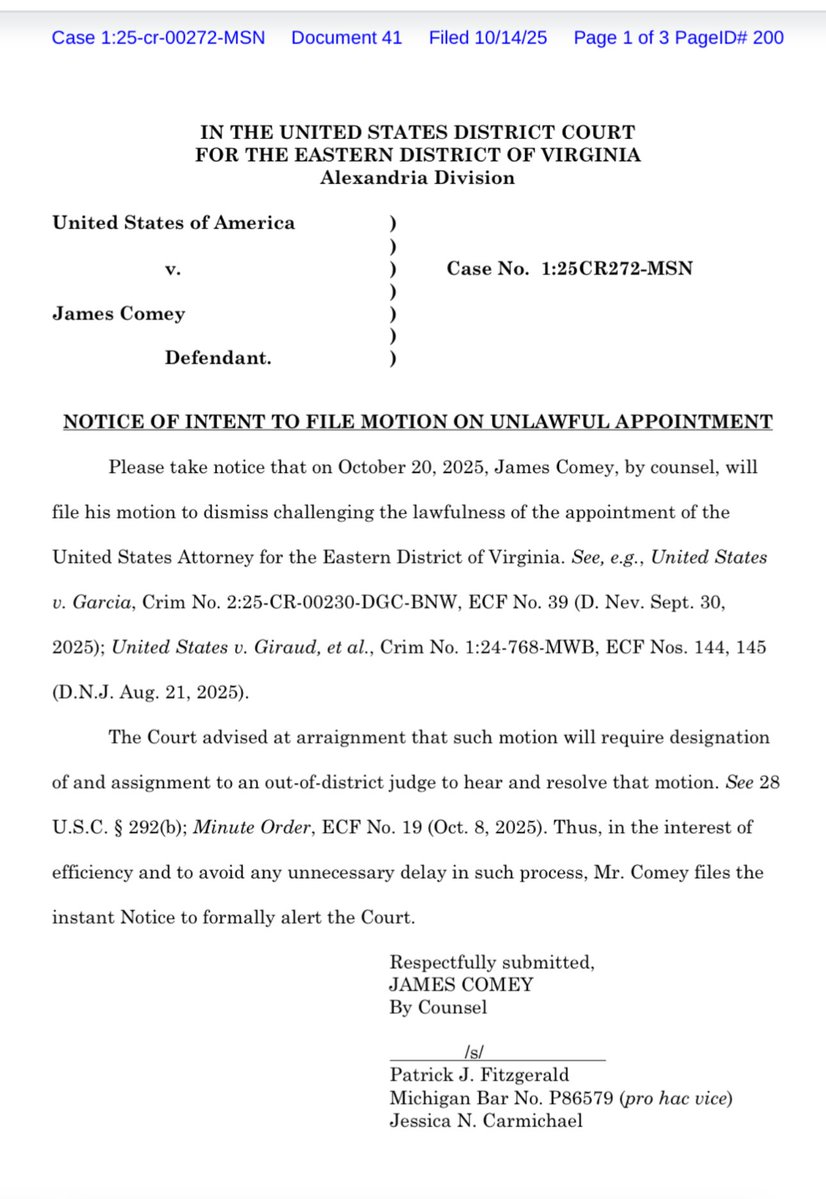 James Comey claims the appointment of EDVA US Attorney Lindesy Halligan was unlawful.